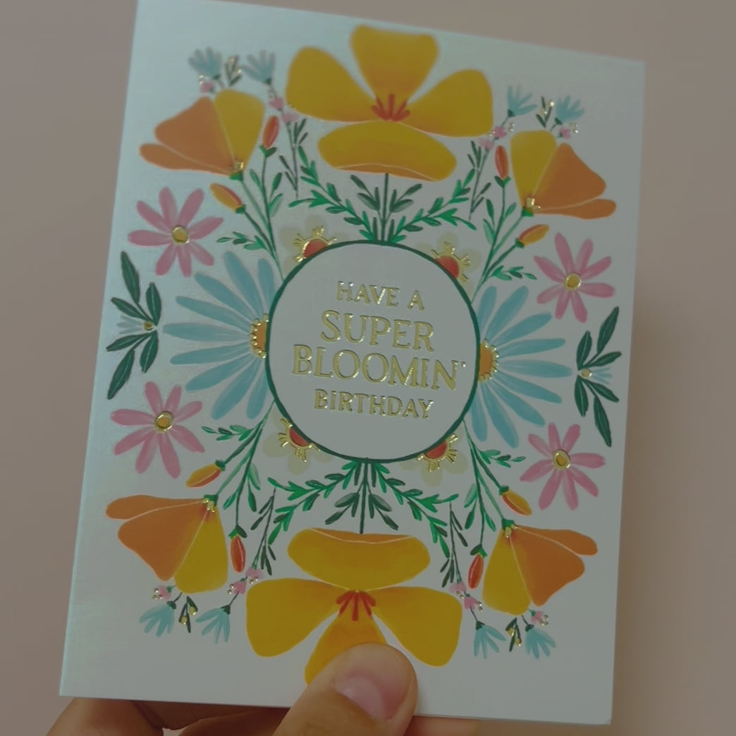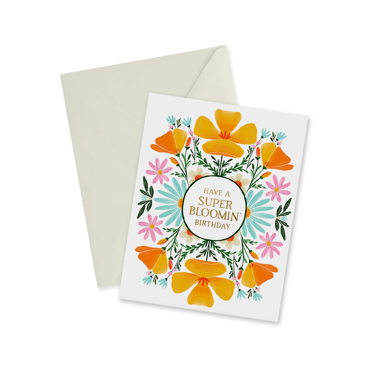 Spread some birthday cheer with this Super Bloomin' notecard, adorned with shiny gold details and vibrant poppy and wildflower illustrations!