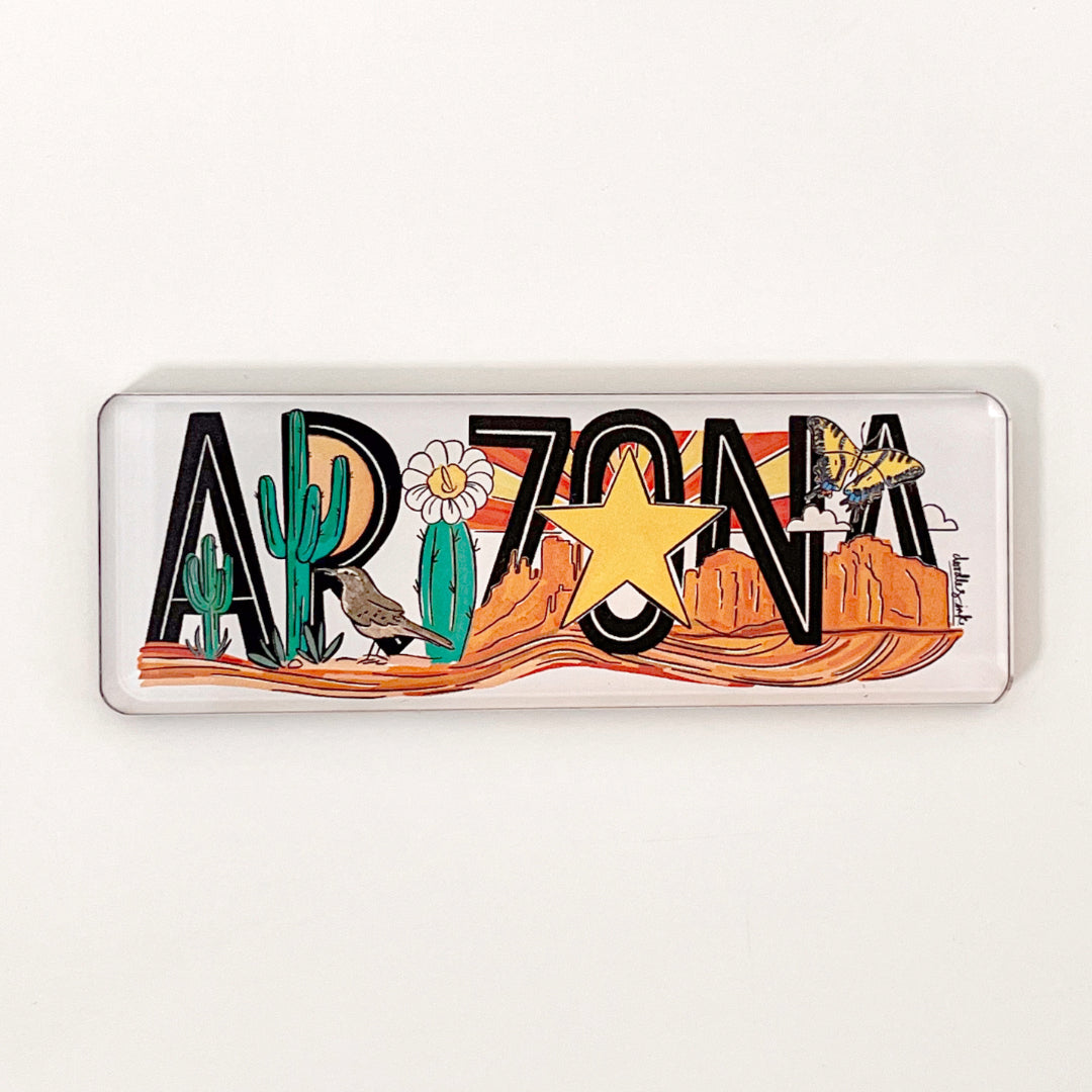 Acrylic magnet featuring unique Arizona lettering, icons, and landmarks that capture the spirit of the Arizona for locals and travelers alike. Perfect for adding a touch of nostalgia to your fridge, office board, or locker—a heartfelt reminder of home and travel adventures.