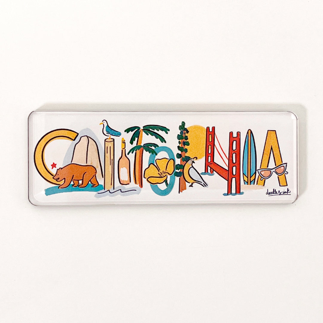 Acrylic magnet featuring unique California lettering, icons, and landmarks that capture the spirit of the California for locals and travelers alike. Perfect for adding a touch of nostalgia to your fridge, office board, or locker—a heartfelt reminder of home and travel adventures.