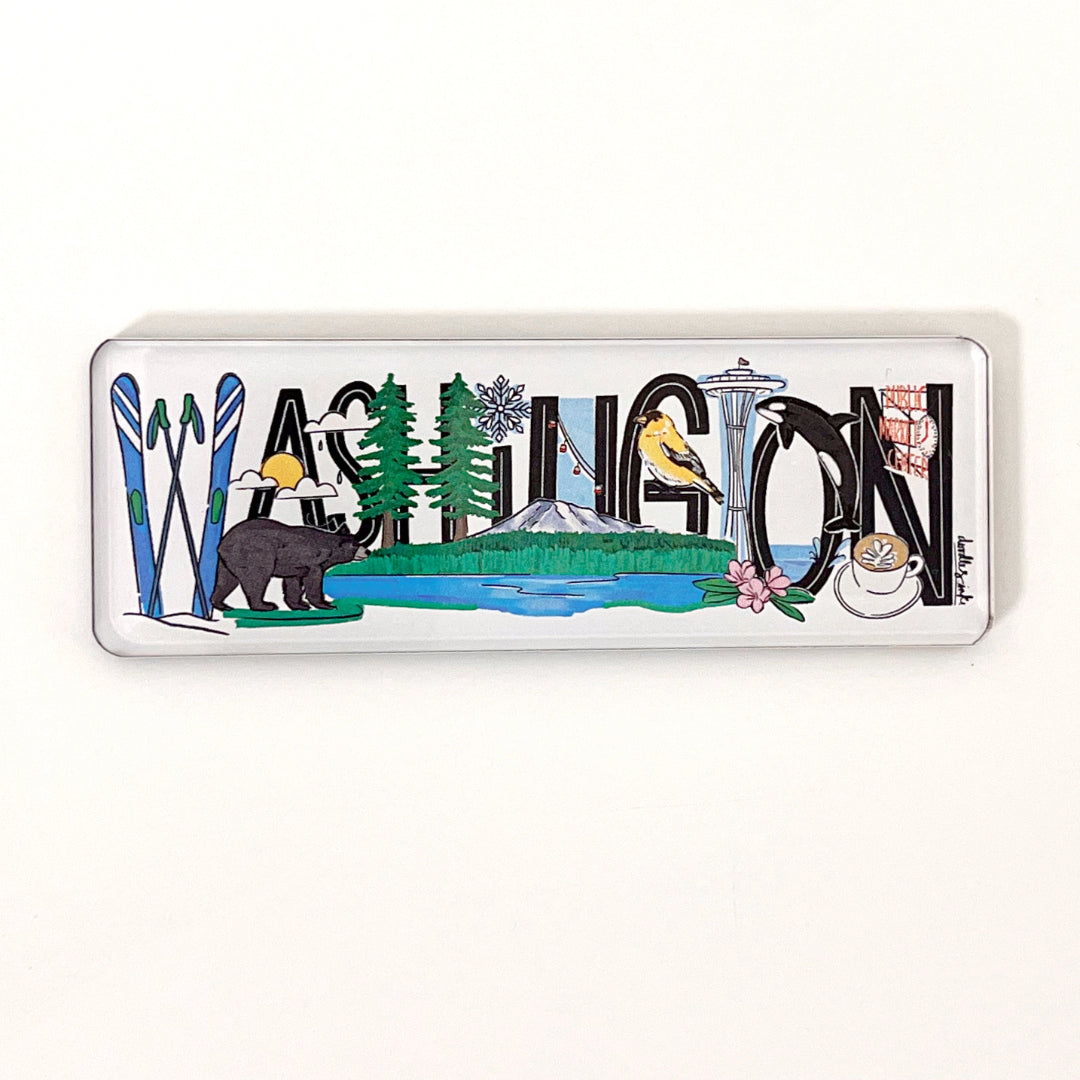 Acrylic magnet featuring unique Washington lettering, icons, and landmarks that capture the spirit of the Washington for locals and travelers alike. Perfect for adding a touch of nostalgia to your fridge, office board, or locker—a heartfelt reminder of home and travel adventures.