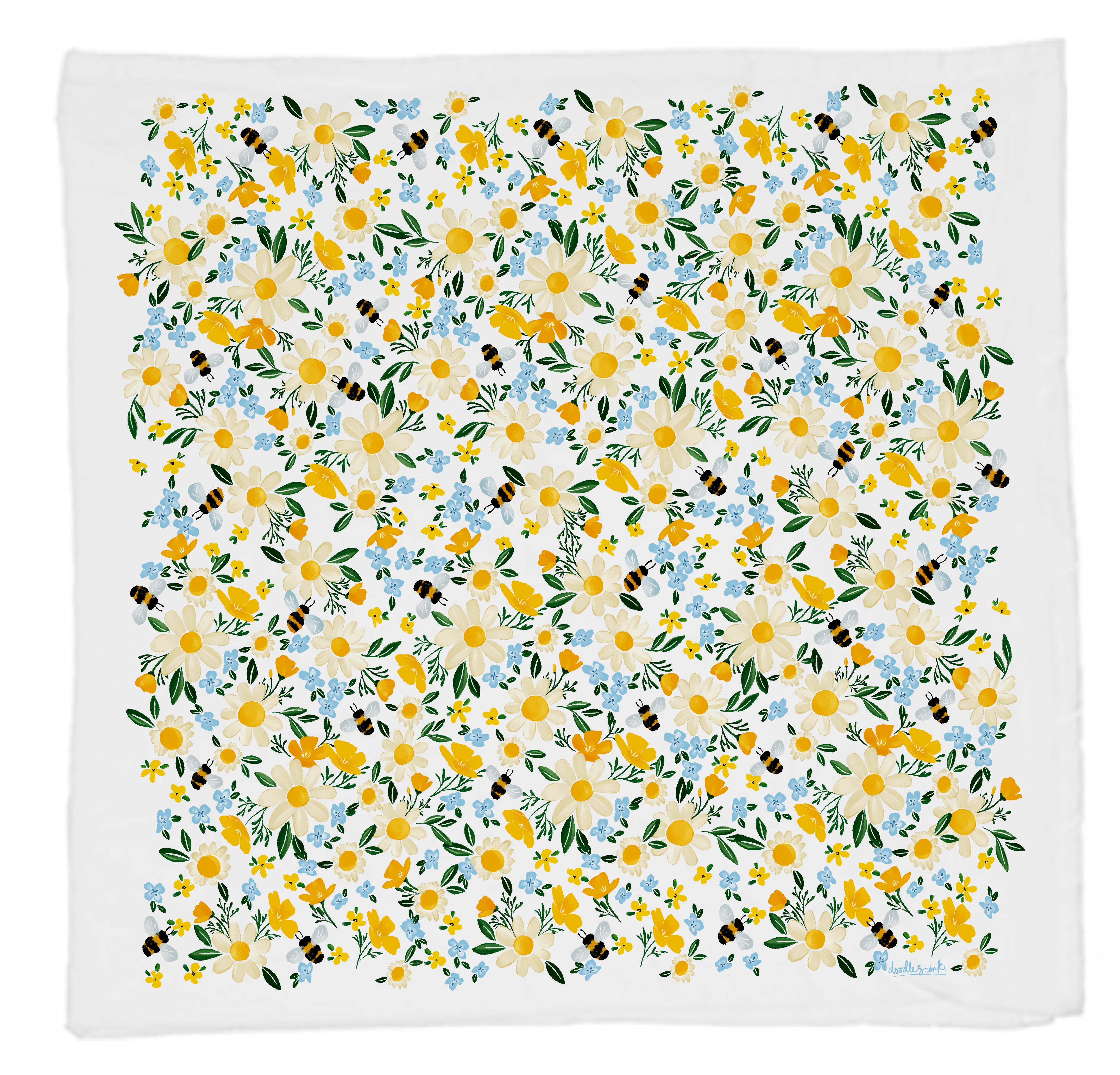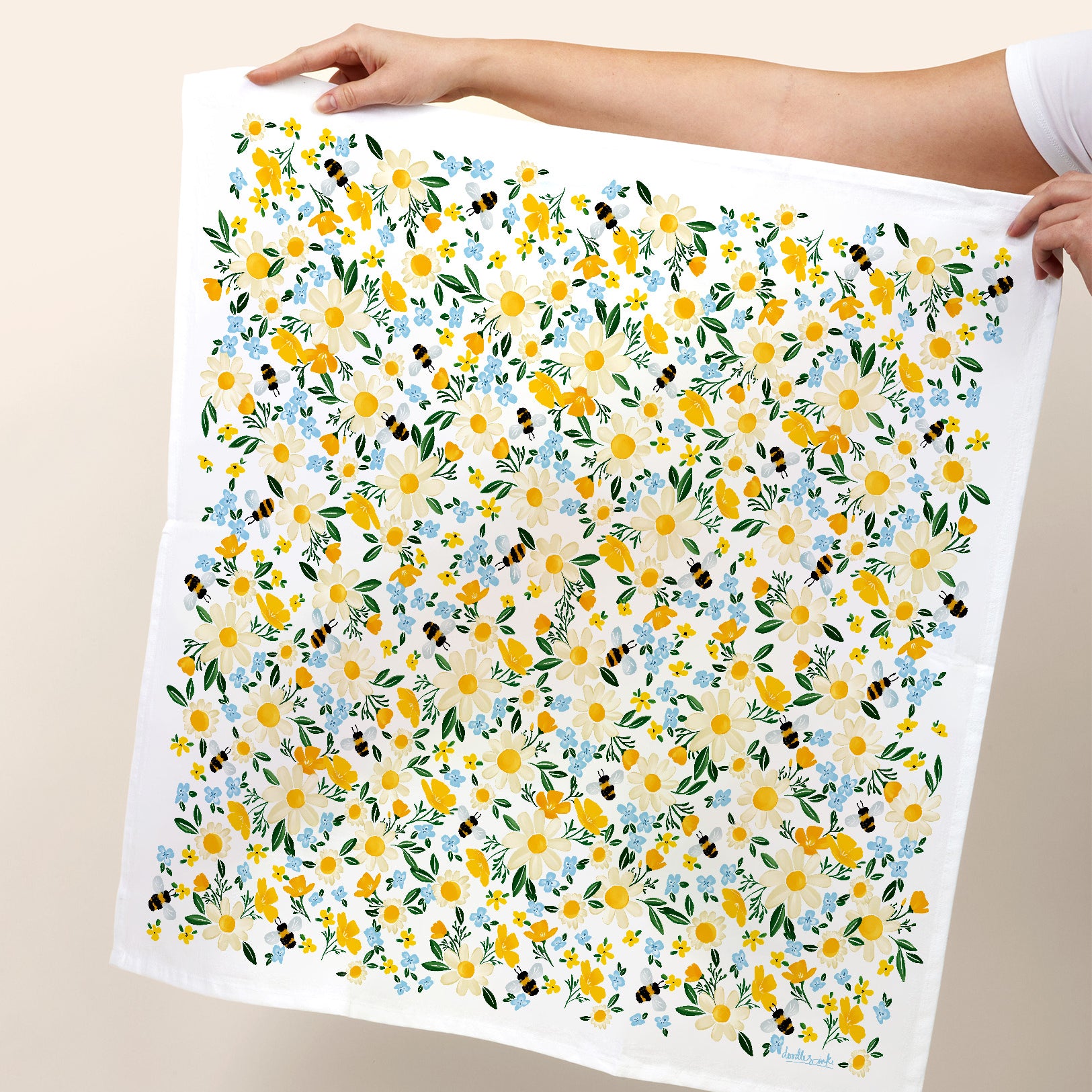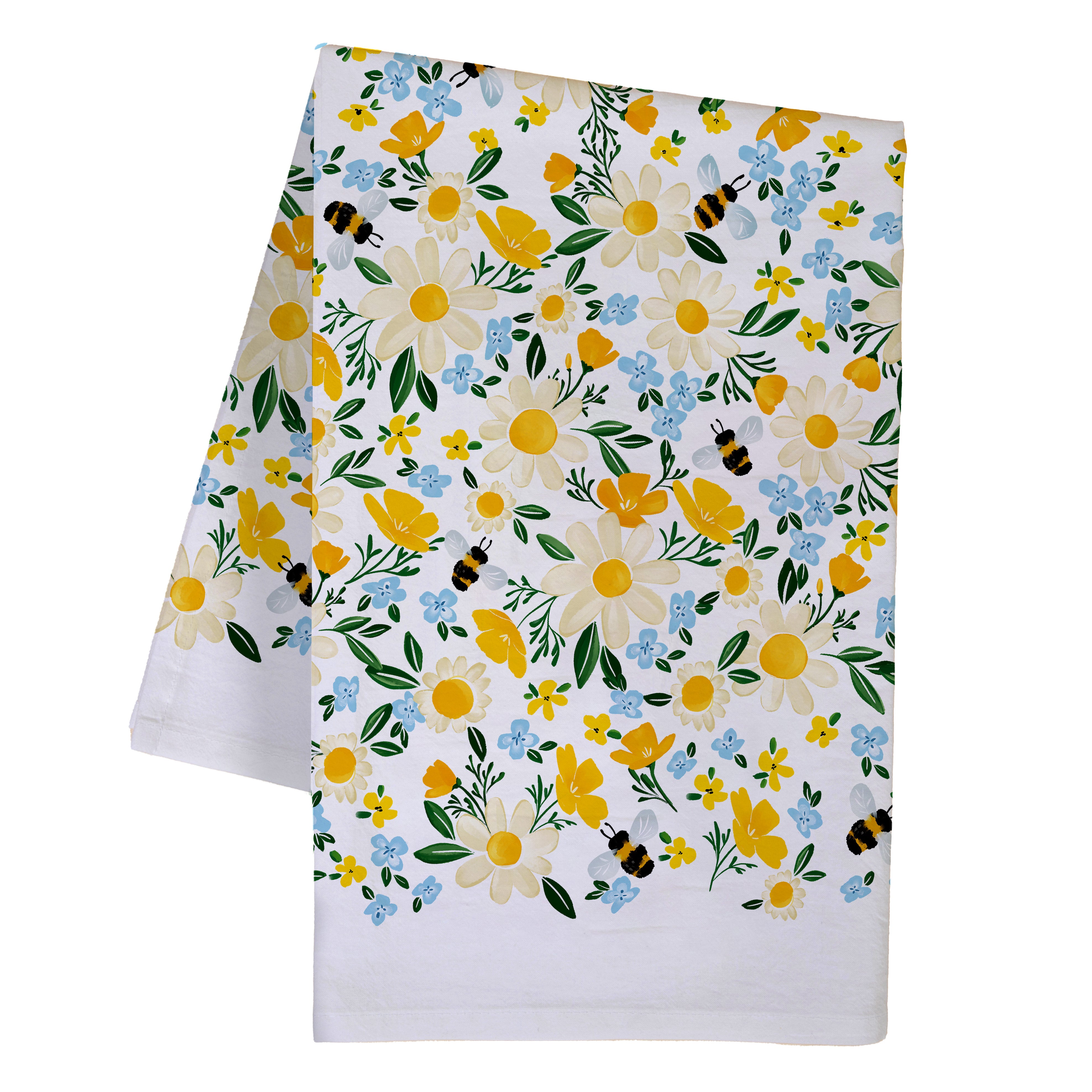 Bee-utiful Blooms Tea Towel showcasing vibrant bees buzzing among wildflowers—a perfect choice for drying, decorating, or gifting!