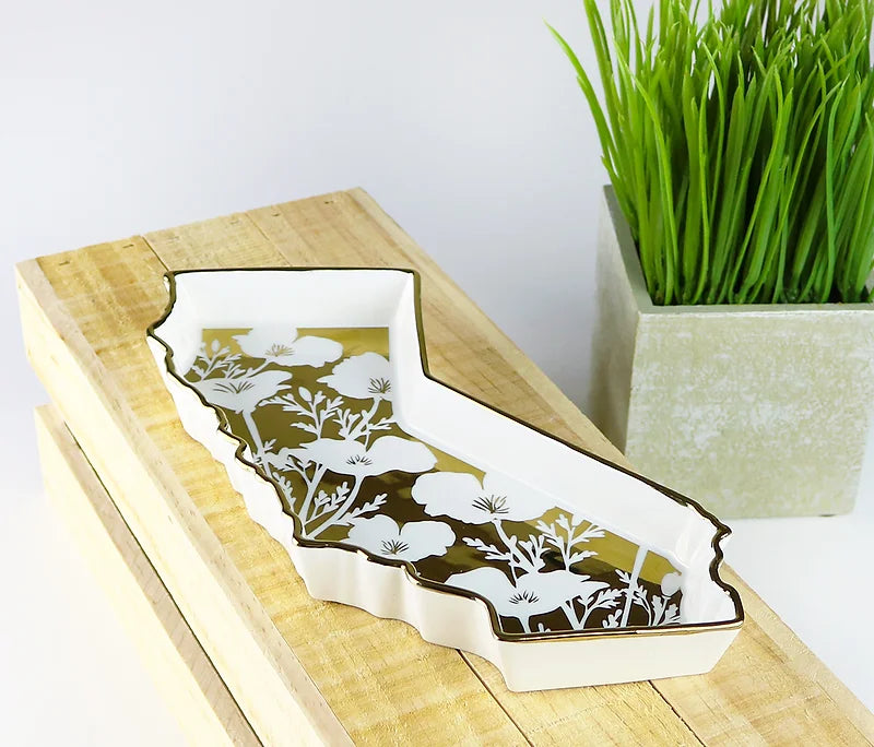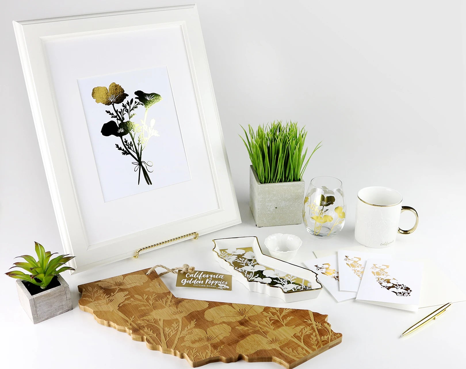 doodles.ink. and SF Mercantile proudly brings the Golden State to your table. We've come together to create a tabletop set perfect for entertaining and everyday use. The collection includes an etched bamboo California cutting/cheese board, ceramic California platter, poppy shaped dipping bowl, poppy relief mug, and gold poppy stemless wine glass.